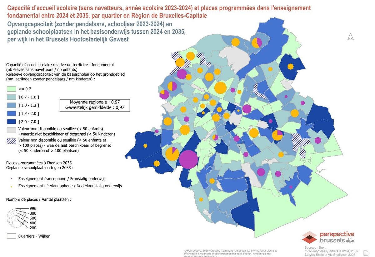 Attention : cet indicateur ne tient pas compte des élèves dits « navetteurs », qui résident en dehors de la Région mais fréquentent une école bruxelloise. Il mesure uniquement l’adéquation entre les places scolaires existantes dans un quartier et la population résidente en âge de fréquenter l’enseignement fondamental.
